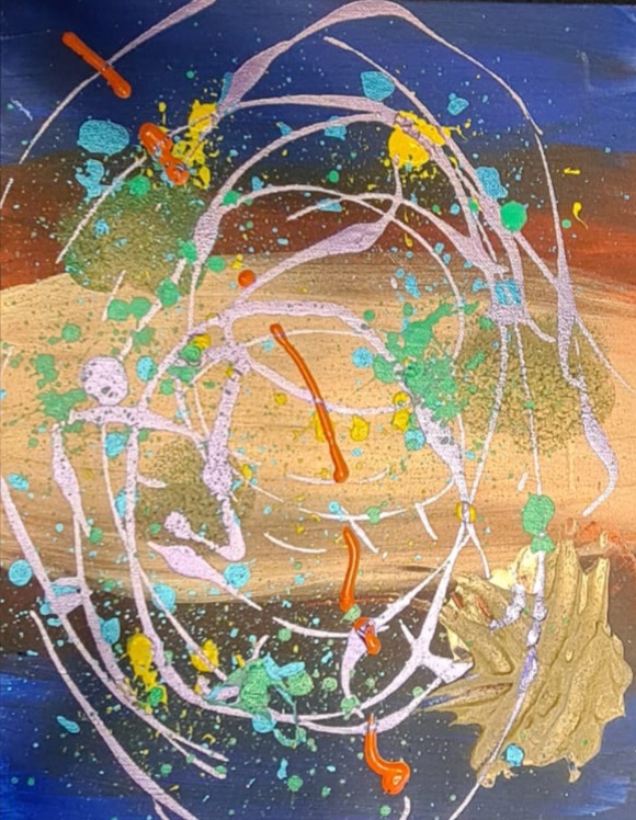 Mit einem Wirbel aus Farben, die sich über eine lebendige Leinwand verteilen, fängt dieses Gemälde die Energie und Dynamik des Universums ein. Die goldenen und kupfernen Akzente verleihen dem Werk eine erdige Tiefe, während die spritzigen Farben die unbändige Freude der Schöpfung darstellen.