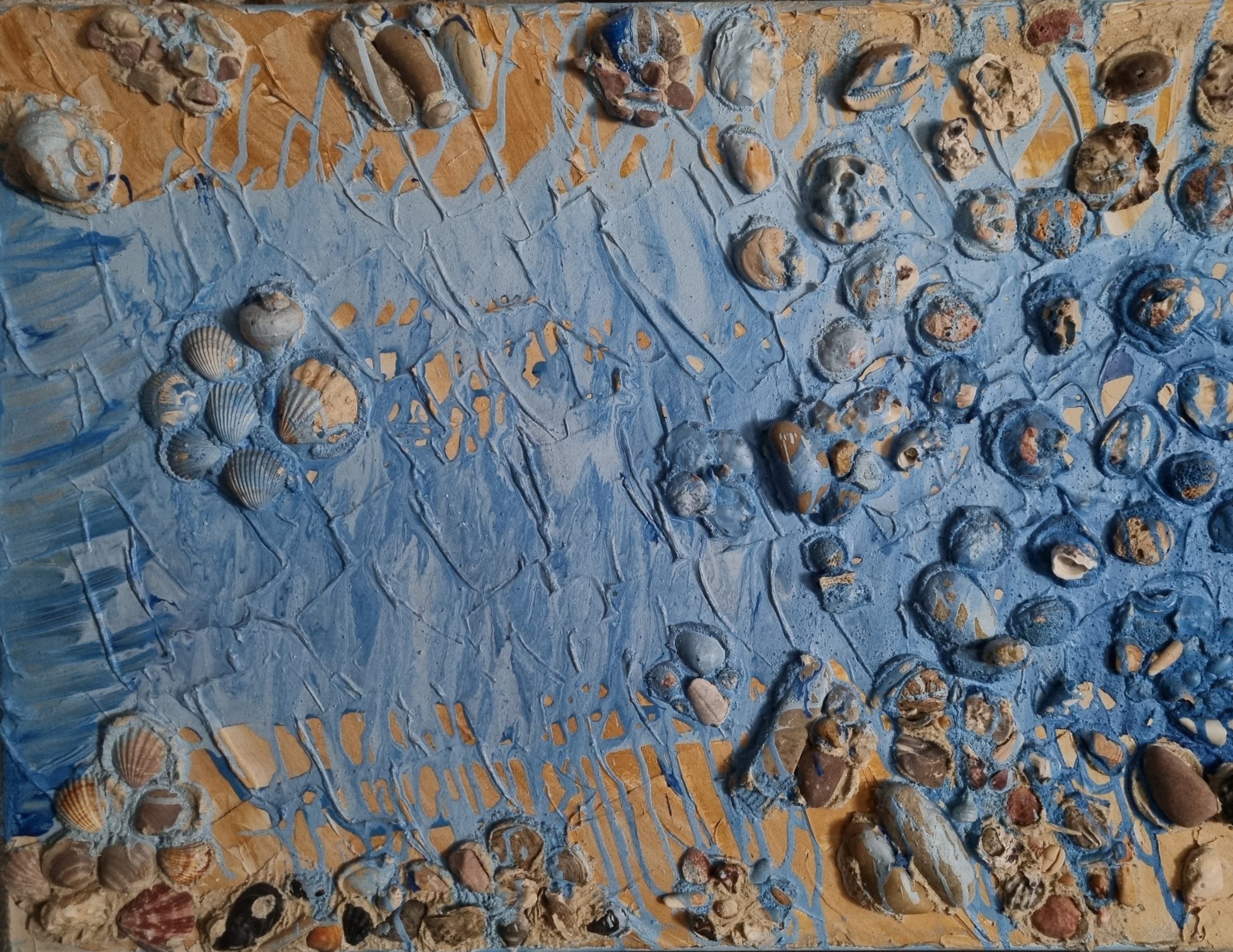 In diesem Werk verwebt sich die Textur des Meeresbodens mit den sanften Wellen des Ozeans. Eingebettete Muscheln und Sandkörner verleihen dem Bild eine dreidimensionale Lebendigkeit, die das Rauschen der Wellen und das Echo des Meeres einzufangen scheint.