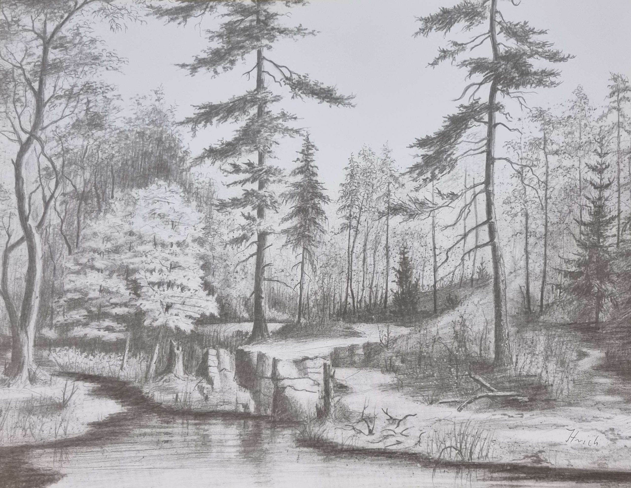 Diese Zeichnung fängt die ruhige Stimmung eines dichten Waldes ein, mit sanft fließendem Wasser, das die Stille unterbricht. Die Detailtiefe der Bäume und die feinen Schattierungen vermitteln ein Gefühl von Frieden und zeitloser Natur.